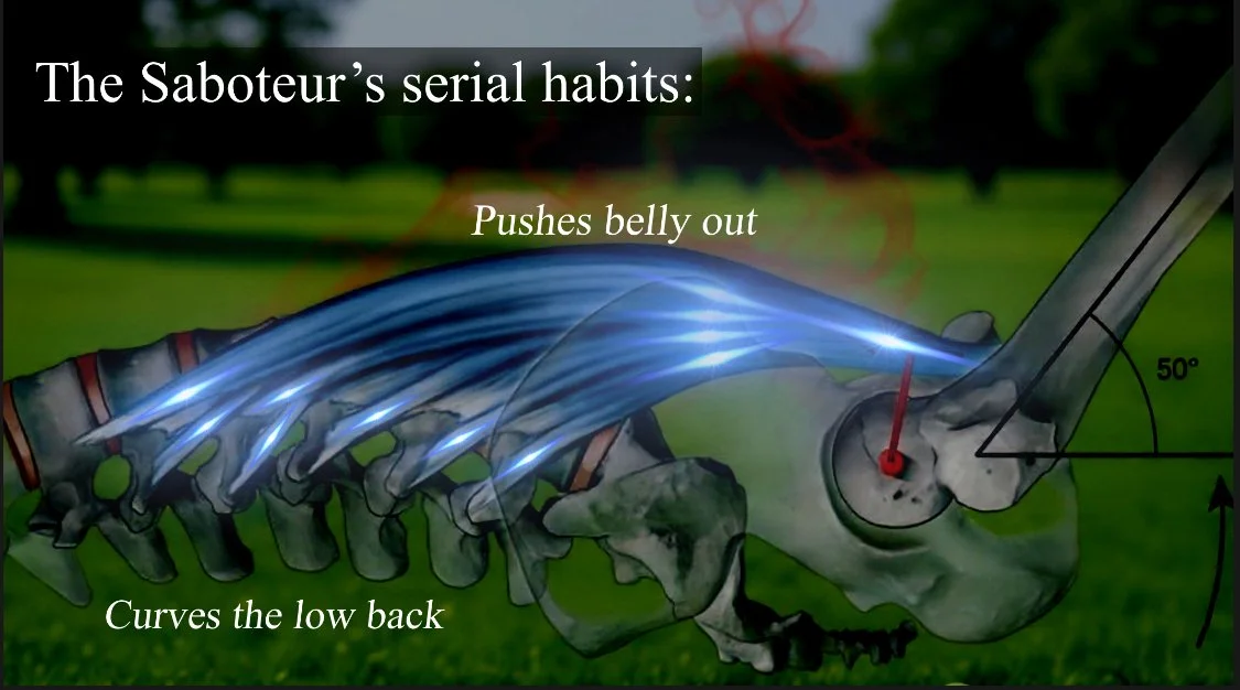 The Saboteur operates by stealing space. When the Epicenter (your core) fails to anchor the pelvis, the hips take the path of least resistance straight forward.
